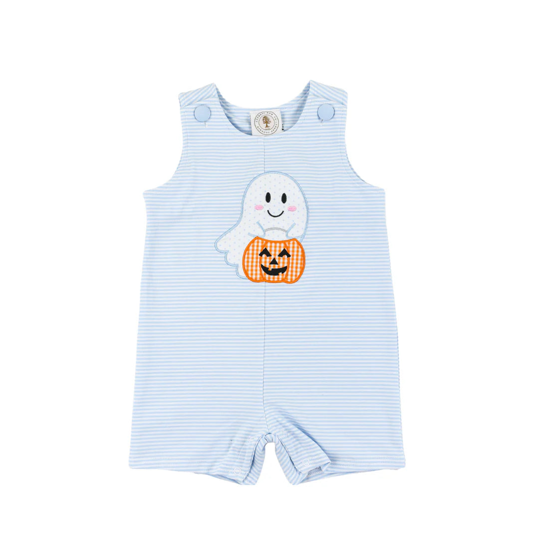 Get ready for spooky fun with the Boys Ghost and Ghouls Bubble and Romper from Cypress Row! This light blue striped set comes in your choice of a bubbly romper or a classic romper, both featuring an adorable happy ghost clutching a pumpkin candy bucket. Perfect for little ghouls and ghosts, it’s a playful and comfy way to celebrate the season in style.