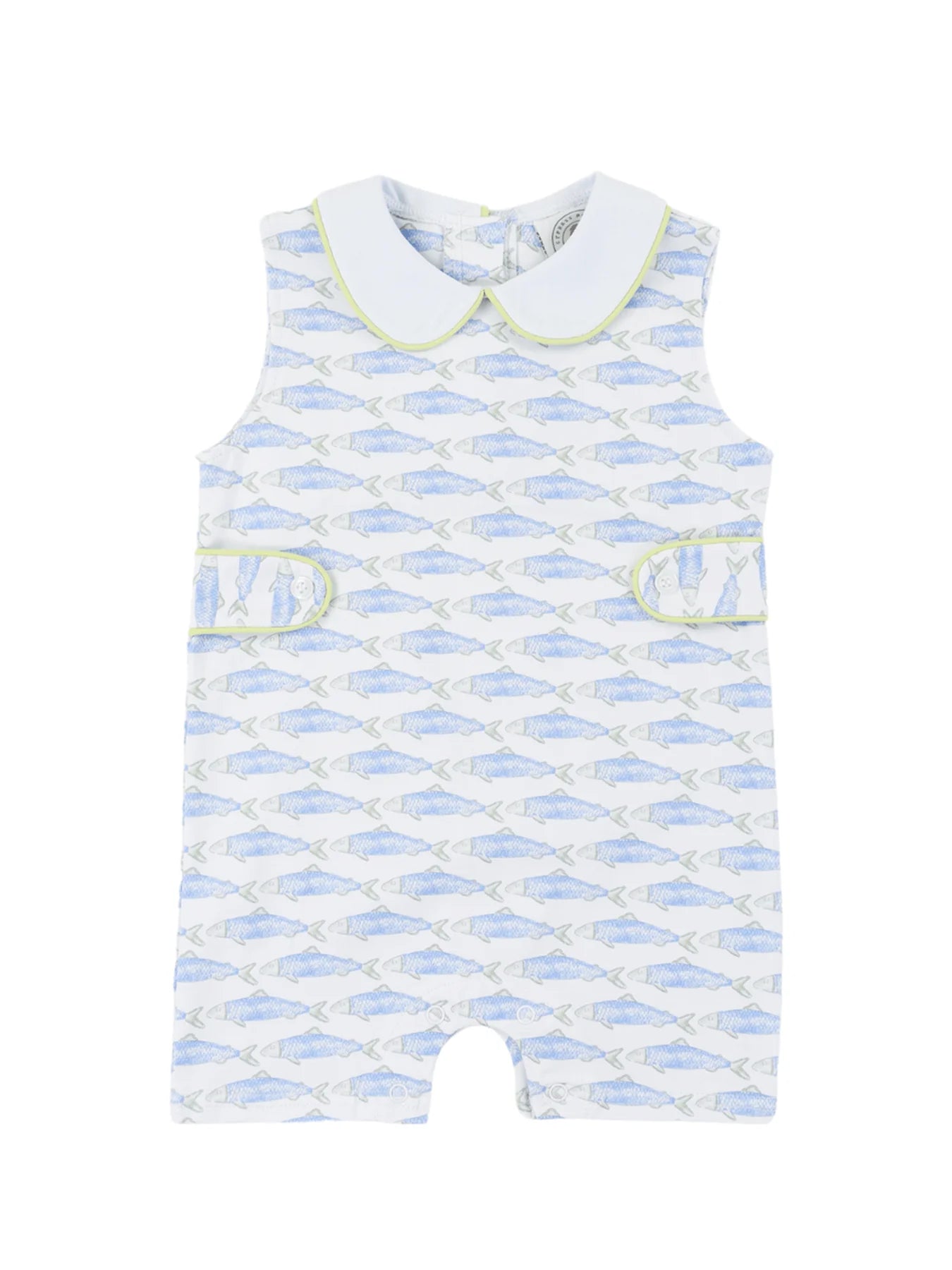 This Jon Jon showcases a playful fish print that's pure excitement for rod & reel adventures. Trimmed with cheerful light green piping, it features a white Peter Pan collar and handsome side tabs. It's crafted for active little ones who love to move and groove. Perfect for warm-weather adventures and those picture-perfect moments that make childhood magical.