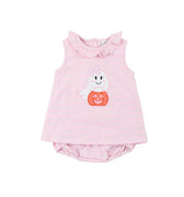 Sleeveless cotton knit bubble with ghost and pumpkin applique.