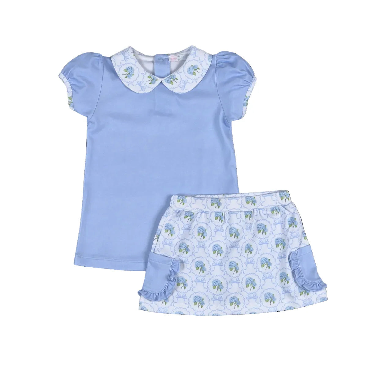 • Hydrangea With Blue Trellis Bows print on skort with ruffle blue pockets