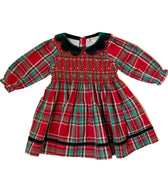 This beautiful long-sleeved dress is made out of our classic Christmas Plaid woven fabric with a beautiful smock design adorned with pearls. The scalloped collar is made out of a delicately soft green velvet fabric with a ribbon of velvet trim above the hem. We hope this compliments your family's Christmas traditions!
