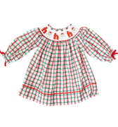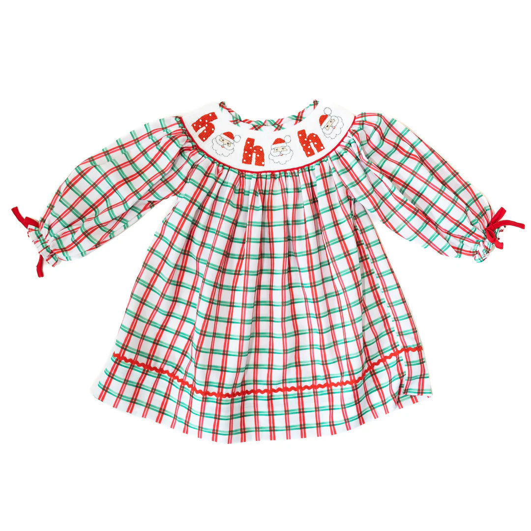 Talk about the perfect outfit to meet the Big Guy! This smocked plaid dress is just precious! The wording Ho Ho Ho is across the smock plate with a Santa face for the O's! Perfect for your sweet little lady & any of your holiday festivities!