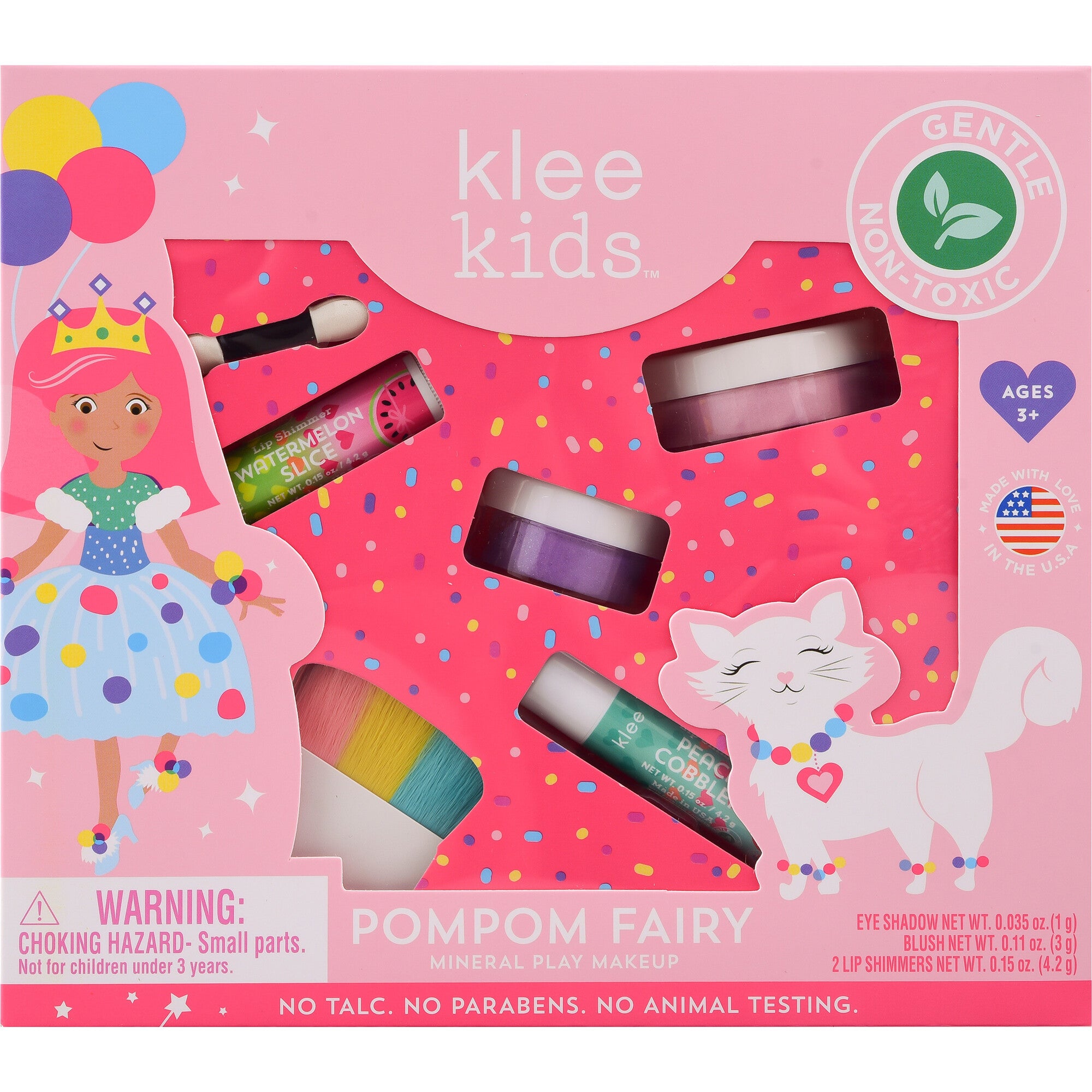 "Gentle, non-toxic, age-appropriate, and made in the USA. Pom Pom Fairy has handsprung her way here to cheer the world up with nature's colorful goodness and create clean, kid-safe makeup with NO talc, parabens, artificial fragrances, or any other nasty chemicals typical in mass-market cosmetics. The Pom Pom Fairy kit include the Cartwheel Purple eye shadow, All-Star Glow blush, Watermelon Slice lip shimmer, Peach Cobbler lip shimmer, a rainbow powder brush and an eye shadow applicator."