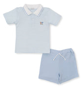 Your baby will be ready for wherever the day takes them in this adorable outfit. Made from the softest Pima cotton, our two piece set includes a polo shirt wth puppy embellishments and coordinating bermuda shorts with our playground pups print and elastic waistband for easy on-off.