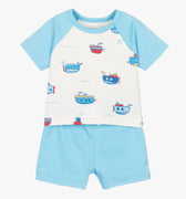 Lovely blue and ivory shorts set for baby boys by Kissy Love. Made in beautifully soft Pima cotton jersey, the T-shirt has adorable blue submarines and whales printed on the front and cute, raglan sleeves. It fastens with simple poppers on the front, helping to make dressing your little one easy. Ideal for little tummies, the coordinating, ocean blue shorts have a stretchy, elasticated waist with a faux drawstring detail.