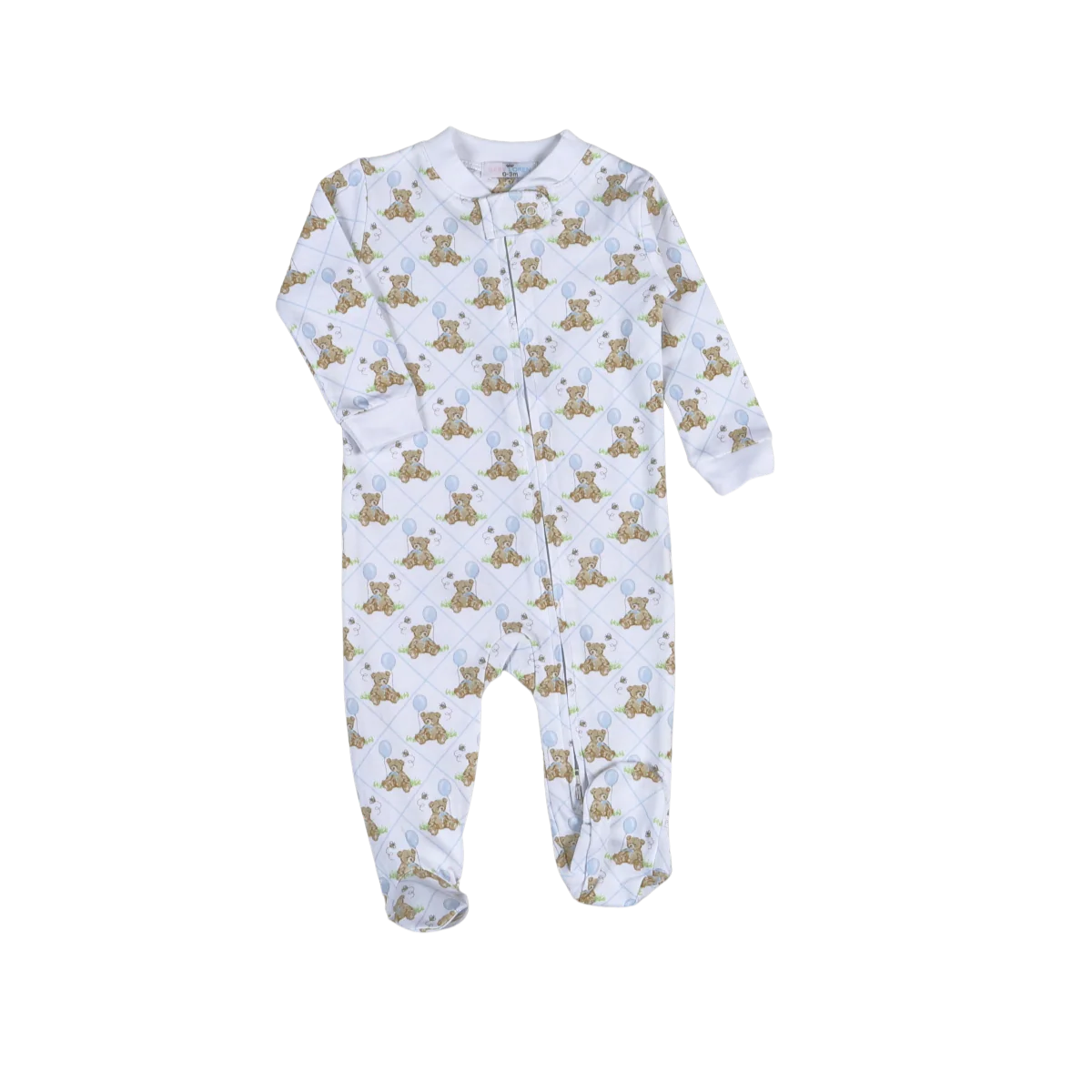 Adorable Teddy Bear zippered footie your little little man.   Has precious Teddy Bears with blue neck ribbons holding a blue balloons.
